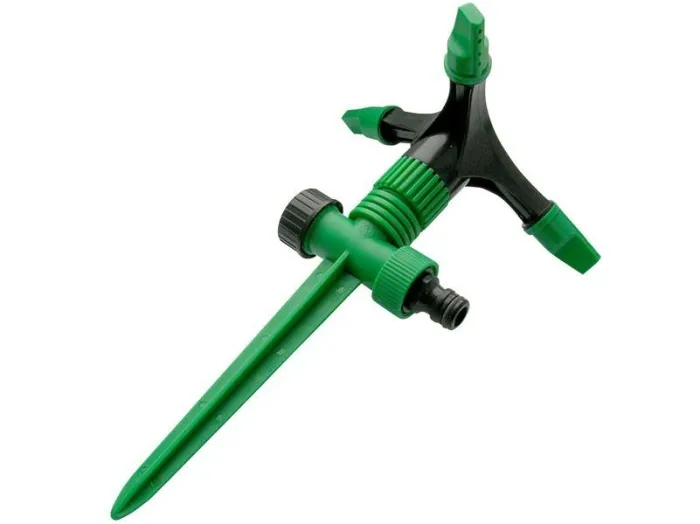 На пике. 3 сопла. Для стационарного орошения почвы. Площадь полива регулируется поворотом сопел. Два соединительных гнезда распылителя обеспечивают его использование в цепи из нескольких распылителей.Материал: ABS пластик.