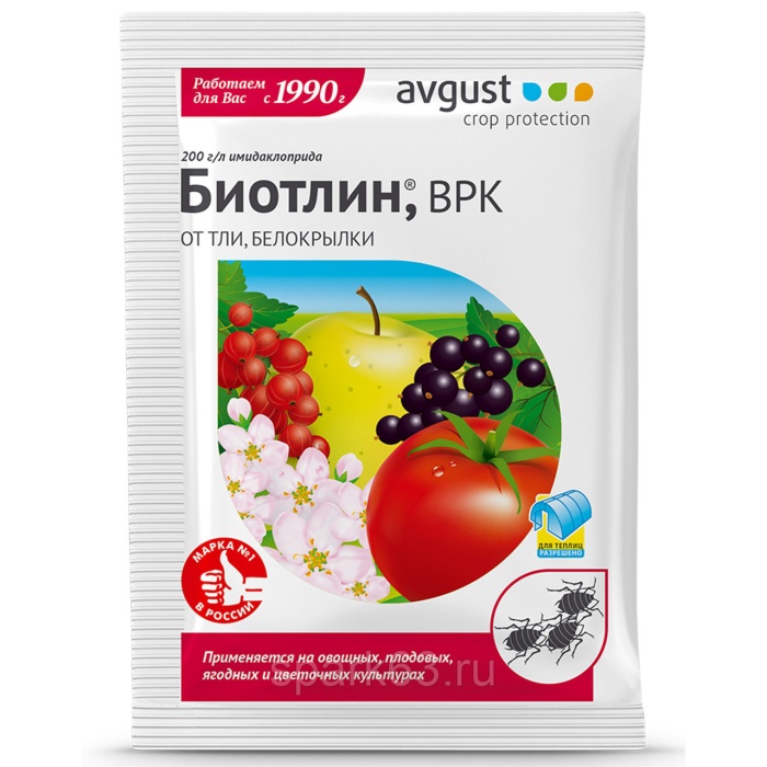 Биотлин — садовый инсектицид быстрого действия, активный в отношении большинства полужесткокрылых огородных вредителей, главным образом тли и ее самого агрессивного подвида — филлоксеры. Препарат дает отличные результаты при обработке им яблонь от цветоеда. От Биотлина быстро погибает белокрылка (в том числе тепличная), цикадка, трипсы, моль, морковная листоблошка, почвенная мушка и др. Наибольший эффект достигается применением Биотлина от вредителей в закрытом грунте.