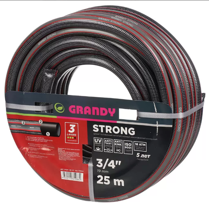 —Шланг 25м, 3/4 '', 19 мм, 18 атм, армированный, 3 слоя, Grandy, Strong, ПВХ, PGH-19E-25