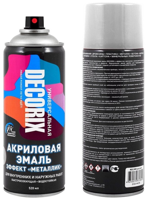 Высококачественная универсальная акриловая эмаль DECORIX с эффектом металлик предназначена для бытового применения, декоративно-оформительских работ, строительства и ремонта. Большой выбор цветов