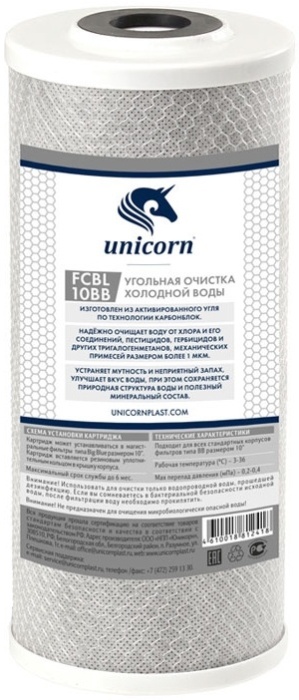 Картридж угольной брикет FCBL 10ВВ Unicorn. Катридж из прессованного угля для сорбционной очистки воды от хлора, органических соединений, улучшает органолептические показатели воды (вкус, запах, цвет).