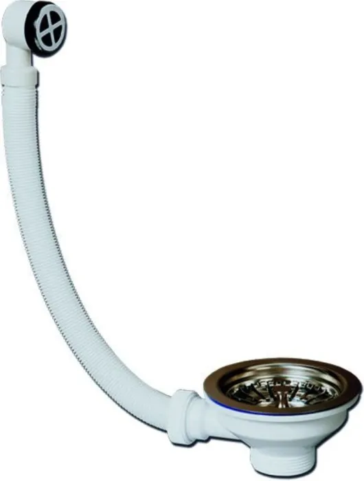 Выпуск для сифона для кухонных моек с нержавеющей решеткой и переливом. Сетка сливного отверстия служит пробкой.