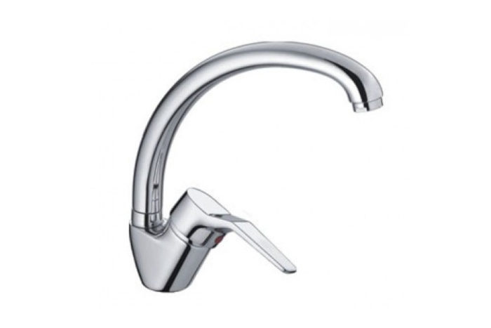 Frap смеситель для мойки, излив высокий, поворотный, однорычажный керамический катридж 40 мм, крепление на шпильках, корпус латунный, покрытие хром, гибкая подводка 35 см.