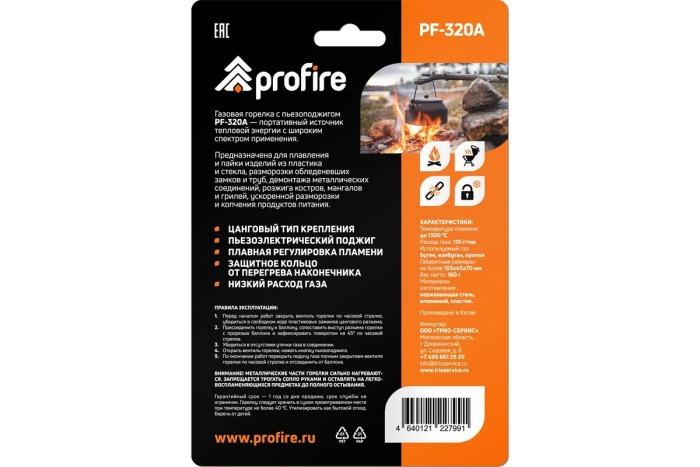 5. Горелка газовая портативная Profire PF-320A, с пьезоподжигом