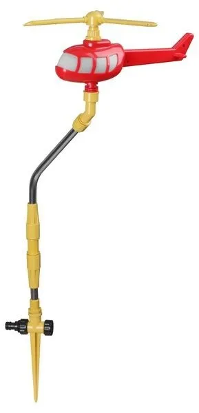 Под напором воды распылитель, выполненный в форме вертолета, вращается во все стороны на 360°, обеспечивая равномерный полив территории.