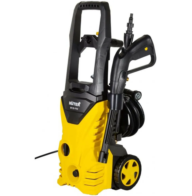 Мини-мойка HUTER M135-PW оснащена пистолетом-распылителем с защитой от случайного включения. В комплекте идет и пеногенератор, при использовании специального шампуня, он создает плотную густую пену.