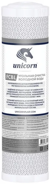 Изготовлен из активированного угля по технологии карбонблок. Надёжно очищает воду от хлора и его соединений, пестицидов, гербицидов и других тригалогенметанов, механических примесей размером более 1 мкм. Устраняет мутность и неприятный запах, улучшает вкус воды, при этом сохраняется природная структура воды и полезный минеральный состав.